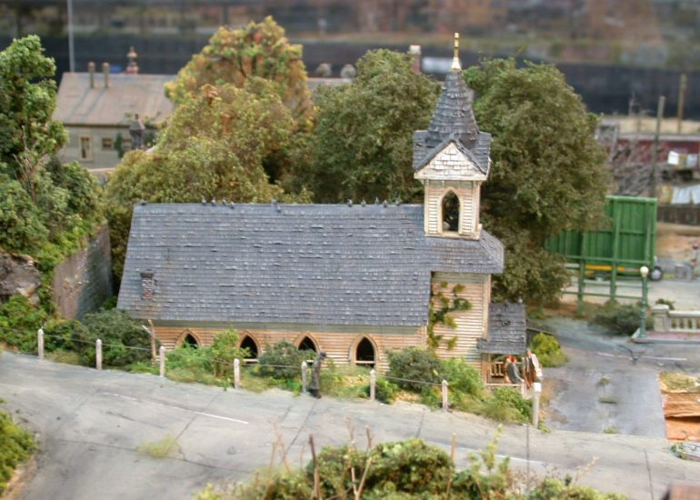 I love the church with its fancy windows and also how it sits lower than the road (from this view)