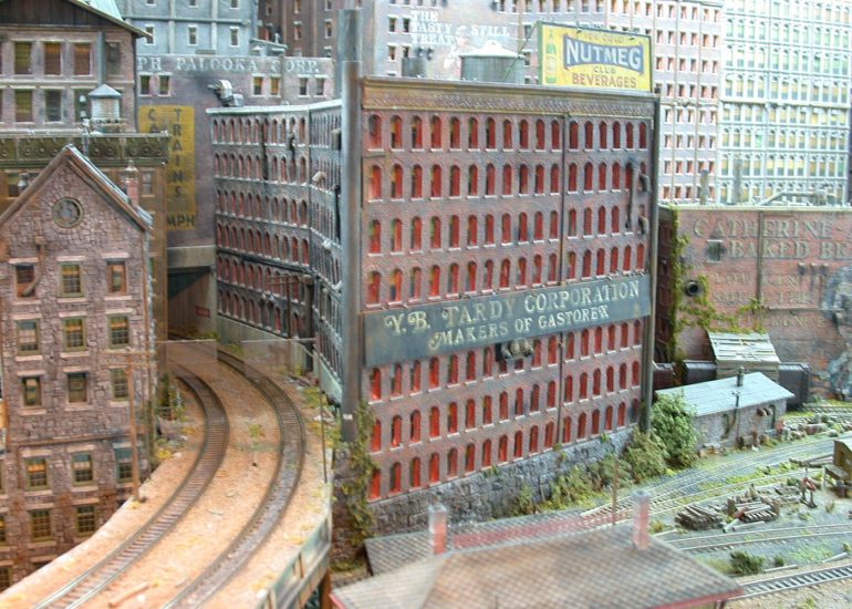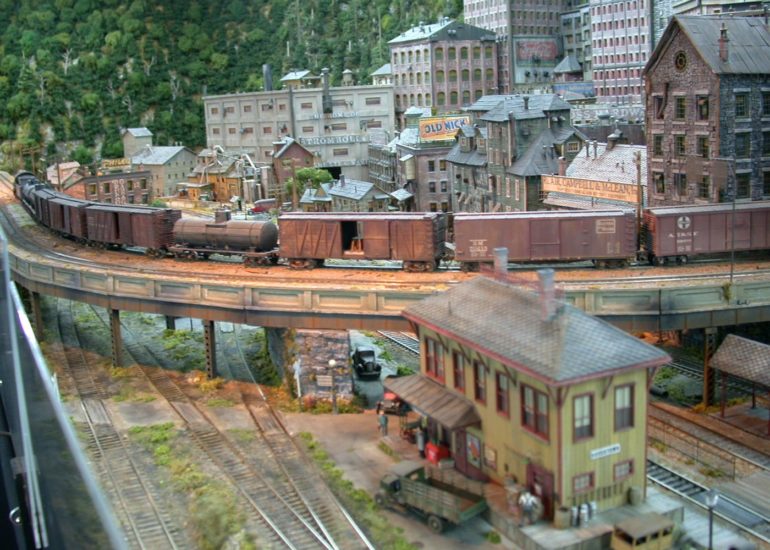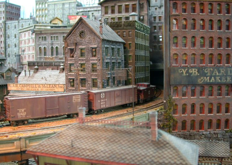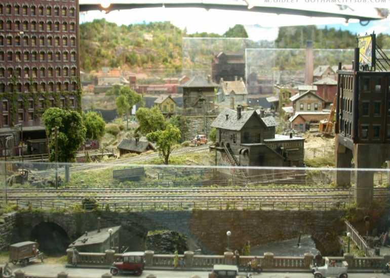 See! he does run trains! A freight rumbles over the elevated line. The station in the bottom of the pic is a new addition- replacing the old burned down Fine Scale Miniatures small station