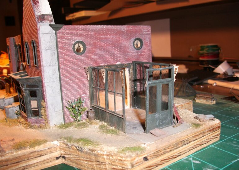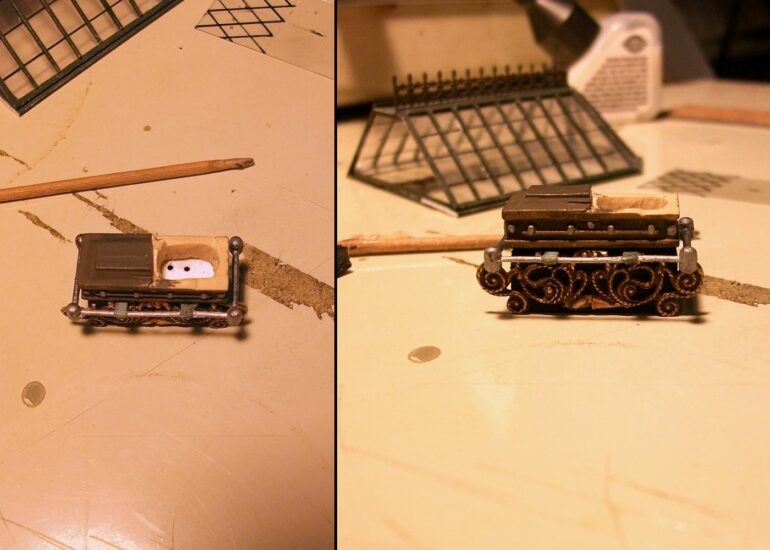 I wanted to have a zombie opening up a green-lighted coffin, so I started by cutting apart a Woodland Scenics one.