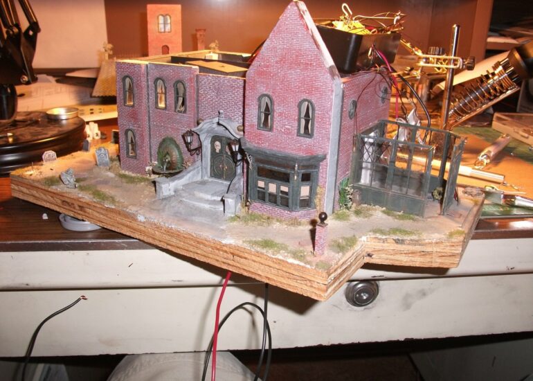 I knew from the beginning that Grimm's needed lighting. I hadn't done an involved wiring project like this before and I decided to use Ngineering's great slate of lighting effects products. Tim at Ngineering gave me some great help in determining how to integrate his products and we worked up the following wiring diagram together. The house lights all work off a single 12v supply and the booster board and structure simulator enable each "room" to randomly turn on and off. I used an arc sim and and a gas sim for two of the rooms. The arc sim flashes between two different color LED's and the gas sim slowly fades in and out. With those cool rooms ready, I added a few other "normal" lights to other rooms, using a flicker circuit I put together from cheap LED candles. The conservatory has a green coffin light and a room light that are always on.