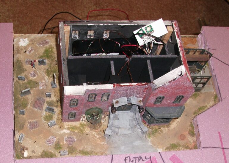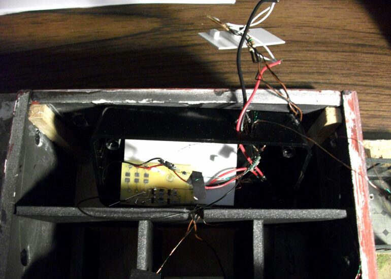 Here a cardstock cover has been added to focus the light downward. You can also see the hole for the coffin wiring.