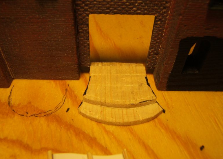 I took a whole series of pictures right off to see how things looked and make sure they were in the right proportions. Here is the door with the original kit stairs. You can see the fountain propped up at left.
