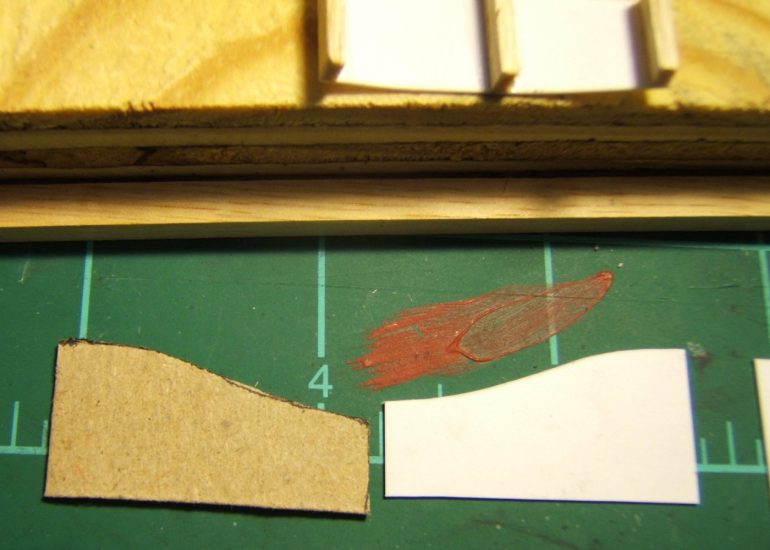 I've seen others use wood for stairs, so that was the natural first choice for me. I drew a shape on bass wood and staring cutting from there. Once I had the bottom piece down, I cut a shorter top piece.