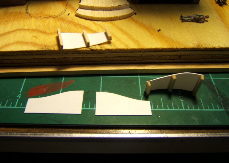 The concrete railings were tough, but I built them like one of the bathroom walls I'm working on in 1:1 scale right now. I cut the sides out of cardstock to get the shape right and then traced that onto styrene and cut it out again.