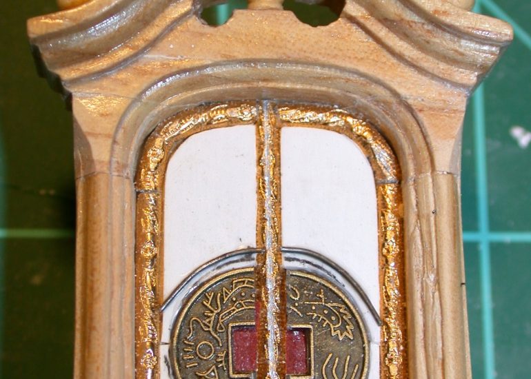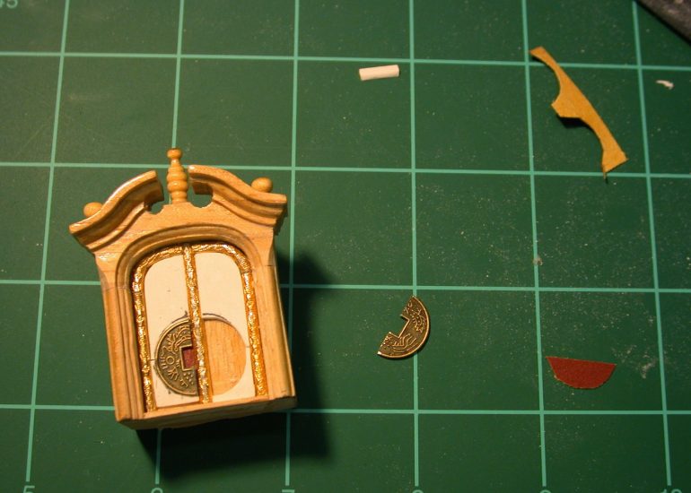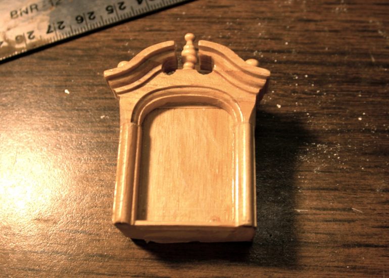 The door was the first thing I did and it took forever! I think it really makes the model though, so it was well worth the time spent. Before I started this project I though - I need to come up with some unconventional stuff! George Sellios is always finding new ways of doing things I need to think like that! So, I went to the hobby store and looked for whatever I could see that might have a use. One thing I found was a dollhouse Grandfather clock. It was perfect for the front. So when I got home it was time to cut it apart. Now I usually joke about cheapo Chinese crap, but whatever glue they used to hold this together was quality glue! Anyway I broke the top portions off and had to glue them back together again. That didn't speed things up! So, after the re-gluing, here is the starting point. I did a little carving on the sides already, but nothing else.