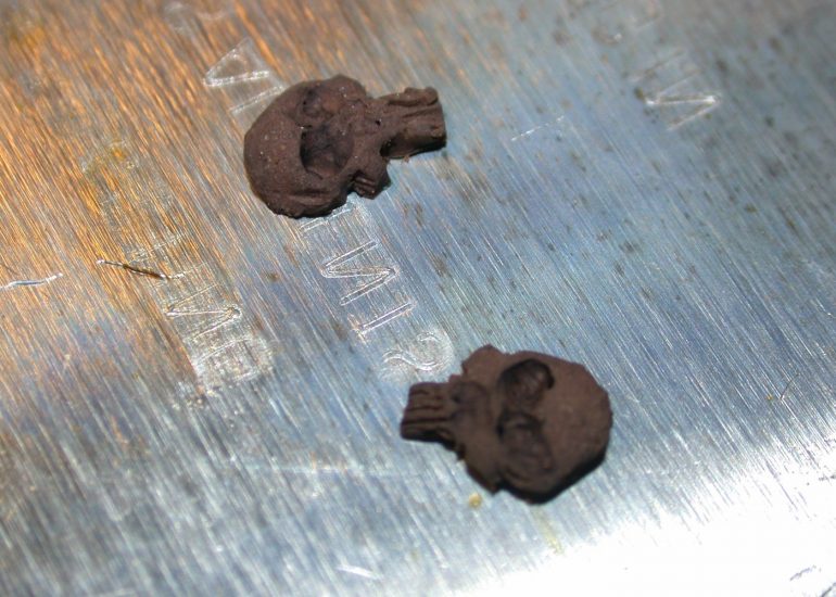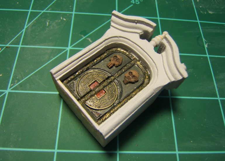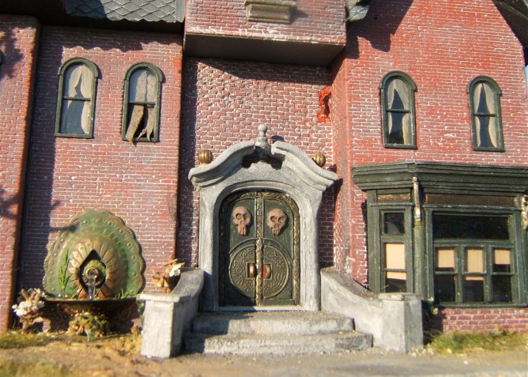 I wanted skulls on the doors. I tried to cut the ones off of the upper window boxes that came with the kit, but they kept breaking. SO, why not make them I thought! So I took some sculpey clay and carved these very small skulls out. The eyes were made with the tip of a ball point pen. Then I cooked them in the oven.