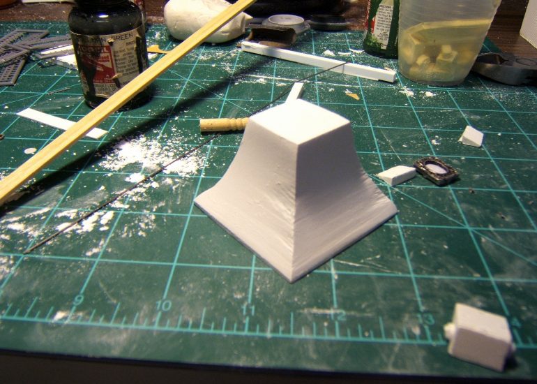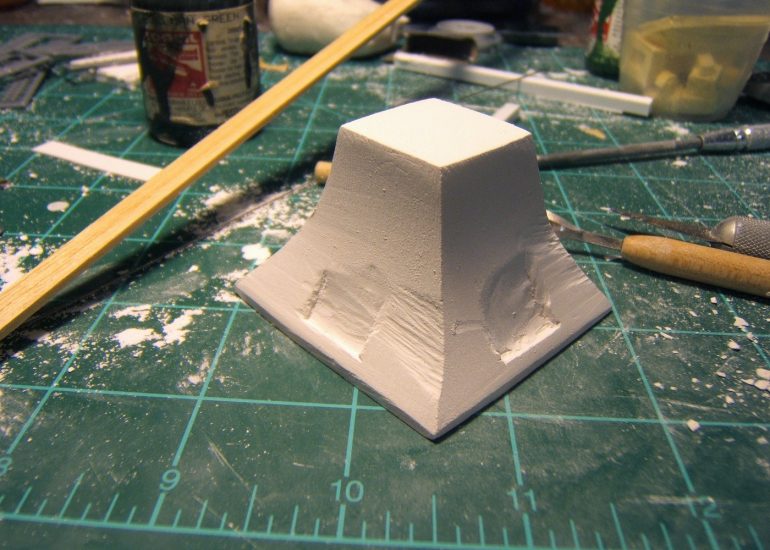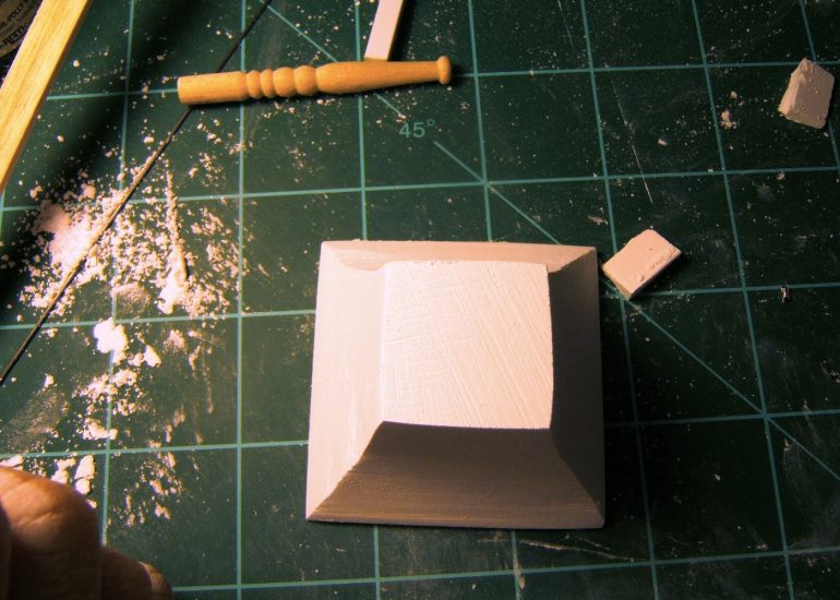One of the big changes I wanted to make to the whole structure was to curve the mansard roof instead of have all the angles be straight. I've seen a lot of curved rooves and they just add more character. As Randy's rooves were solid plaster, I ended up doing the rough carving with a rounded wood rasp and then hitting them with a well supported piece of sandpaper.
