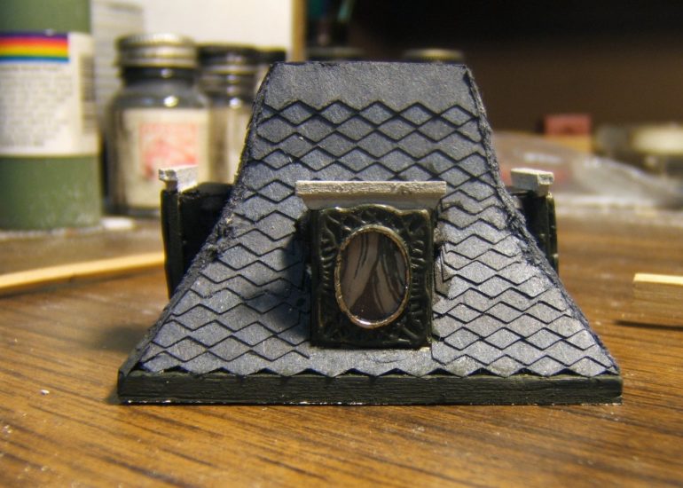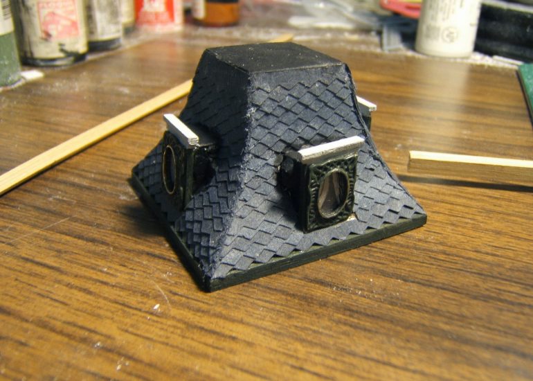 Here is the roof after the windows have been glued on. You can see that I carved a flat place on the bottom as well. On the left is the main roof, which I already started carving the curve into.