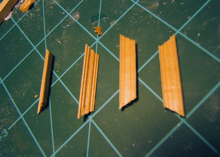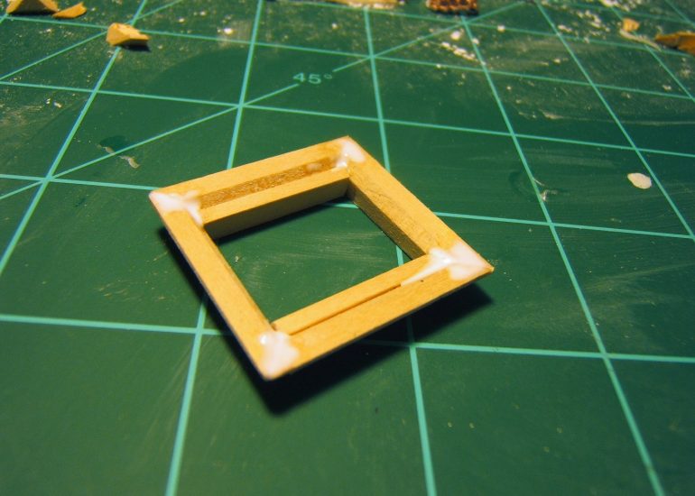 I added some square stock to make the gluing/squaring process easier. For all my wood parts (and most everything else I used Quick Dry tacky glue.) I pour a bit out on a piece of scrap paper and then apply a fine bead with a toothpick. Or I go high tech and use my fingers.