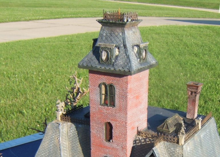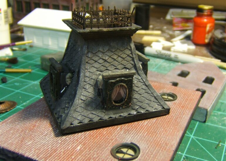 The final tower outside. The sides of the window boxes had skulls molded into them. I painted them grey, but in retrospect I think I should have cut them off. The shingles were dry brushed with white acrylic paint and then dusted with chalks. The railing was spray painted with black and rust paints and then dry brushed white - then chalked. The last detail was the lighting rod which I got from Dr. Ben and painted rust.