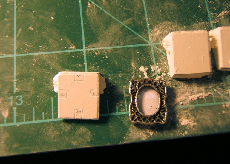 The kit came with little triangular window boxes that were meant to be glued to the straight roof sides. Since I curved the roof I ended up cutting these pieces short and then sanding the backs to match the curve of the roof. The main window section was made from the metal part shown above. If you haven't been to a jewelry store - go! The metal pieces had four pegs on the back, so I cut out places for those pegs in the plaster part (the boxes marked on the part above).