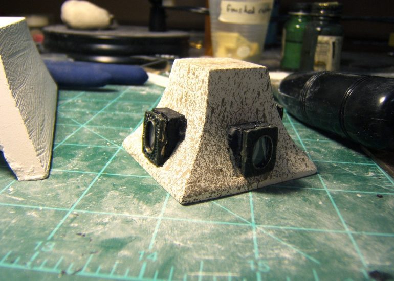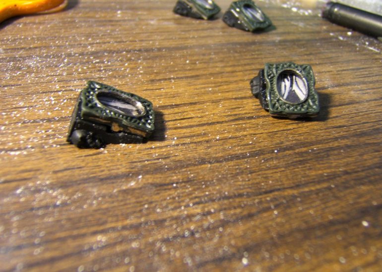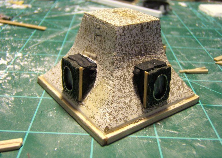 Next up was framing the sides of the window boxes with strip wood and adding the wood base to the roof. The roof was a little small for the tower after all that sanding, so I needed the wood on the bottom to make it wider again - otherwise the proportions just looked wrong. I usually don't seal plaster castings when I paint them, but I sealed both rooves with dullcoat to make sure the glue would stick okay. (Allthough epoxy would probably stick to Crisco.)